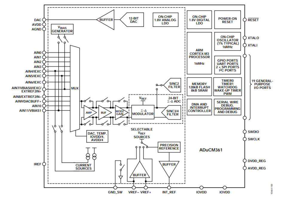 ADuCM361内置32 位ARM Cortex-M3® 处理器,常见的外设如UART、SPI、IIC、Timer、DMA、DAC、Watchdog都有集成,非常方便使用;自带一个片内32 kHz 振荡器和一个内部16 MHz高频振荡器使硬件设计可以省去外部晶振电路;最令人刮目相看的是它集成了4 kSPS、24 位高性能多通道Σ-Δ型模数转换器(ADC),可在全差分和单端模式下工作,ADC模块集成硬件滤波器,可以选择配置高速滤波器来进行步进变化检测,也可选择低速滤波器用于精密测量;内置一个低噪声、低漂移带隙基准电压源,也可选择外部基准电压源;附带的可编程激励电流源,可以应用于许多电流驱动型的传感器。