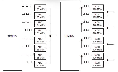 在并行模式下,多个ADC在每个通道上相位性取样,以增加分辨率、提高动态性能和减少噪音。使用并行模式,分辨率被增加到125MS/s采样率下每通道14位(70dB SFDR)。如果只需要2个通道,那么分辨率可以提高到15位。在单通道模式下,所有ADC被组合起来,可在62.5MS/s采样率下提供16位分辨率。软件给你两种选择:选分辨率或选示波器保持“自动分辨率”模式,把最高可能分辨率用于所选择的设置。