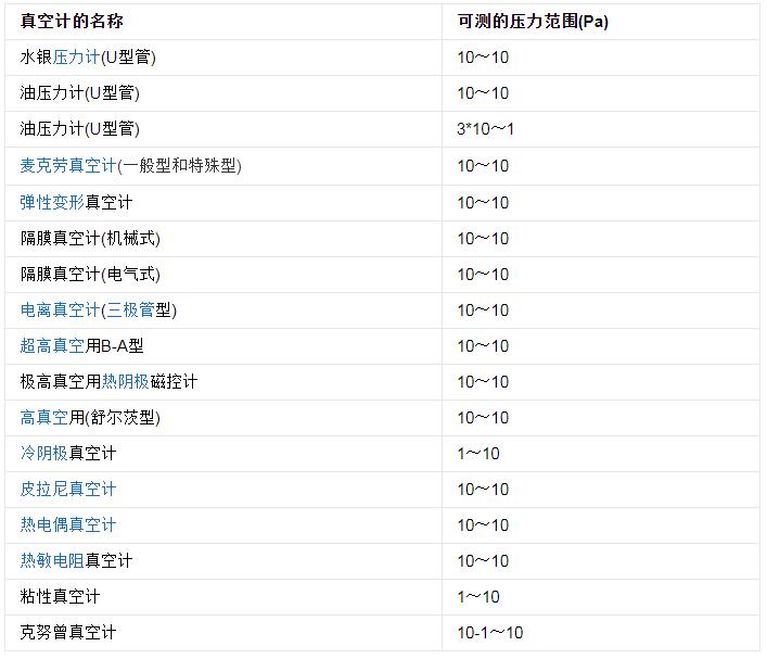 表 真空计的适用压力范围