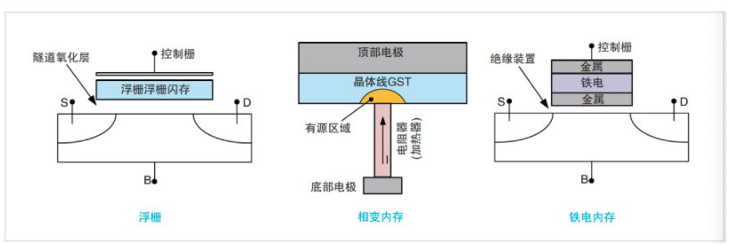 消费电子行业日益担心浮栅NVM(非易失性内存)不能继续以每比特更低成本来提供更高的存储功能,而每比特更低成本则是驱动NVM市场发展的根本性要求。浮栅方法可能会“撞墙”,意味着替代技术的研究工作已经变得日益关键。科学家们正在研究可以替代FG NAND技术的NVM备选方案,包括相变内存(PCM/PRAM)、电荷俘获内存(CTF/SONOS)、电阻内存(ReRAM)、铁电内存(FeRAM)和磁阻内存(MRAM) 等。