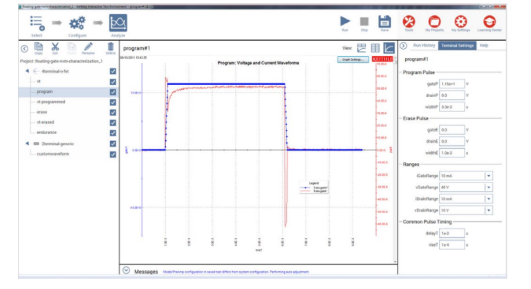 Clarius 软件带有一套NVM 表征使用的范例项目。可以使用Memory 过滤器在Project Library 项目库中找到范例项目。这些项目为闪存、PRAM、FeRAM 和ReRAM 器件提供了测试和数据,演示了4200A-SCS 特别是4225-PMU 及4225-RPM 的功能。上图是闪存器件项目浮栅非易失性内存表征项目的截图。4225-PMU/4225-RPM 相结合,提供了基础脉冲和瞬态I-V 测试功能,可以考察和表征各种NVM材料和器件。