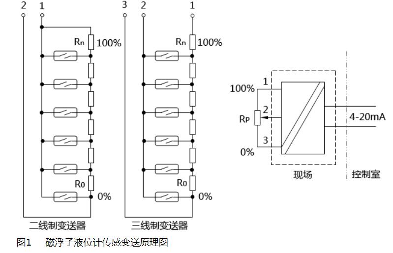 当被测容器中的液位升降时,磁浮子也随之升降,浮子内磁钢的磁力线穿过测量导管,通过磁耦合控制干簧管的通断,以改变与干簧管相连的电阻组件的电阻值。传感变送原理如图1所示,其采用分压电路对液位进行测量,产生的电压与液位成正比关系,变送器进行的是V/I变换工作,最终磁浮子液位计以二线制4-20mA或三线制4-20mA输出液位测量信号。