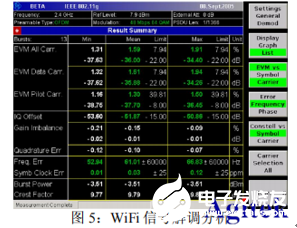 如 OFDM 调制信号,它采用多载波技术,每个载波互相正交,而且每个载波的调制方式也不尽相同,例如 QPSK、16QAM、64QAM 调制,目前这种复杂的数字调制信 号都采用 IQ 调制,I 和 Q 通道增益是否一样、是否有直流成分、是否完全正交相差 90 度都会影响误差矢量幅度 EVM。如图 5,显示的是 ZVL 的信号分析功能解调分析 IEEE802.11g 信号的部分结果,显示出 EVM、IQ 调制结果、频率误差、调制时钟误差、功率和峰均比等。