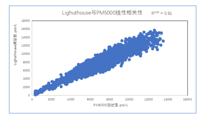 为了验证在线粒子计数器是否能够满足实际应用需求,四方光电将样品送到韩国第三方测试机构进行了PM5000S与Lighthouse手持式粒子计数器委托对比测试,测试数据表明,PM5000S与Lighthouse线性相关系数R²=0.91,r=0.95