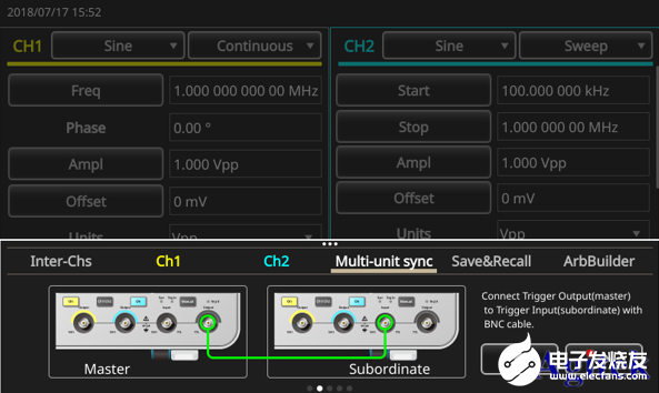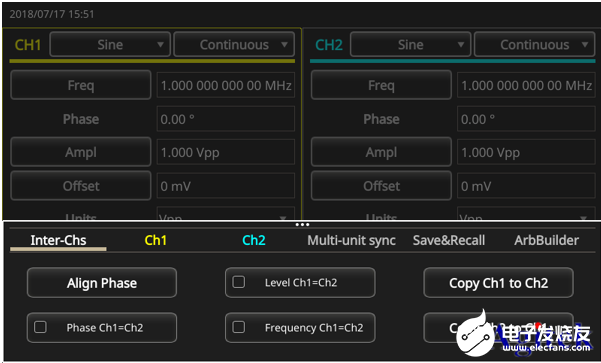 · 把Frequency CH1=CH2 设置为On,启动Align Phase,激活双通道信号发生器的同步模式;此外,AFG31000 简化了多台同步过程,它在屏幕上有一个向导工具,可以引导用户完成电缆连接和设置配置,实现多台发生器同步;