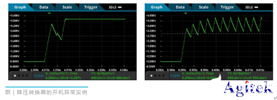 图中显示了输入电流极限下降可能导致的异常开机特点。左面的波形显示了由于初始输入电容器要求的涌入电流不足而导致输出电压下跌。右面的波形一直没有恢复,输出振荡低于预计的 5V 输出值。
