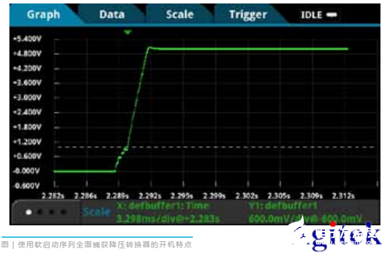 图中显示了多种现象,包括软启动楼梯序列、正常输出斜坡及开机结束时略微过冲。