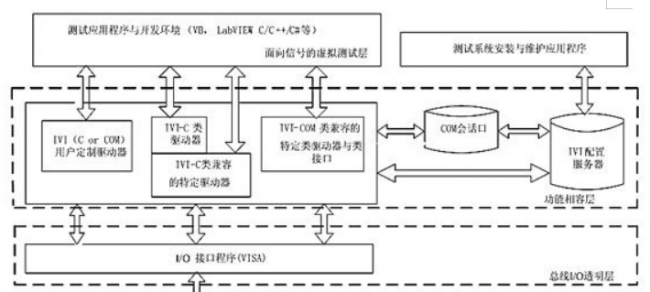 考虑到同类仪器的功能大体相同,驱动程序设计时可以通过封装把每类仪器封装成一个COM组件。通过COM组件的隔离,测试应用程序不用关心底层仪器驱动程序的实现,直接调用COM组件的接口实现对仪器的控制。IVI配置服务器实现对COM组件的配置管理,存储配置信息。驱动程序的COM组件是标准的,对同类仪器的驱动程序来说是完全一致的,只需在配置服务器中更改驱动程序的配置信息,就可实现仪器互换。除IVI-COM驱动器外,IVI-C也是适用于LXI结构的仪器驱动器模型。系统在IVI层实现不同总线同类仪器的“资源功能相容”。