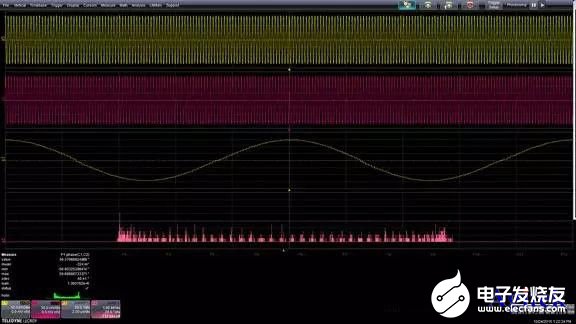 有时相位差不是静态的,需要表征信号相位变化,例如相位调制载波,这种类型的测量依赖于参数时序测量的“所有数据”特性,测量波形的每个周期的相位。可以使用趋势图或追踪图显示动态信息,趋势图是将所有测量值组合在一起的波形。另一方面,追踪图将测量值绘制为时间的函数,与源波形保持时间同步。因此,如果其中一个波形是相位调制的,可以获得瞬时相位的逐周期图,如图4所示。图4中上部波形C1是10MHz载波,通过100kHz正弦波进行相位调制(PM),波形C2(从顶部开始的第二个)是10MHz正弦波,没有调制。相位测量参数读取两个波形之间的相位差,测量的每周期相位差绘制在从顶部向下第三个波形(F1)中作为相位测量参数的追踪图,并且示出相位差与时间的关系,实质上,这解调了PM波形。请注意,除了打开测量统计数据外,示波器还会显示相位参数的histicon(直方图图标),该histicon显示了相位值直方图的微缩版本,指向histicon并单击结果,在底部显示相位差的满量程直方图,直方图将幅度范围分成用户设定的“箱”数。绘制每个箱内的测量值的数量(垂直标度)与测量值(水平标度)的关系,鞍形直方图是典型的正弦信号,追踪图中的台阶数和直方图中的间隙是源波形的每个周期的相位差值保持固定值的结果。
