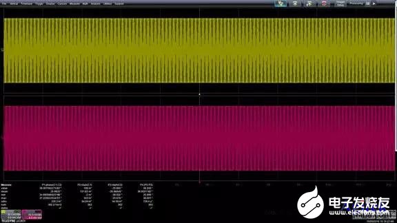 相位参数在时域中测量相位,并且依赖于检测穿越用户设定电压阈值的波形转变,来自信号源和示波器本身的附加垂直噪声限制了该测量的准确性,可以通过限制示波器的带宽来提高信噪比,从而使测量的标准偏差值更小,从而获得更准确的读数,通过进行多次测量并使用测量的平均值而不是瞬时值来进一步提高精度。还可以通过计算输入信号频率处的单点离散傅立叶变换(DFT)并读取FFT的相位来在频域中进行相位测量,这是示波器可选的测量参数窄带相位(nbph),图5同时显示了使用相位参数和nbph测量相位差, Nbph在参数光标之间波形数据的第一个数据点处读取指定频率的信号的相位,如果参数光标在其默认位置,则将读取波形数据中第一个点的相位,由于我们对两个信号之间的相位差感兴趣,因此需要进行两次nbph测量,在图5中,我们分别使用P2和P3测量C1和C2波形的nbph,使用参数函数在P4中取得相位差,得到nbph差值为36.000o,相位参数读数为35.993o。注意,nbph测量的标准偏差明显低于相位参数的标准偏差,这是因为对于1000周期的采集长度,nbph测量具有更窄的测量带宽(105kHz),请记住,nbph是一个示波器可选参数。