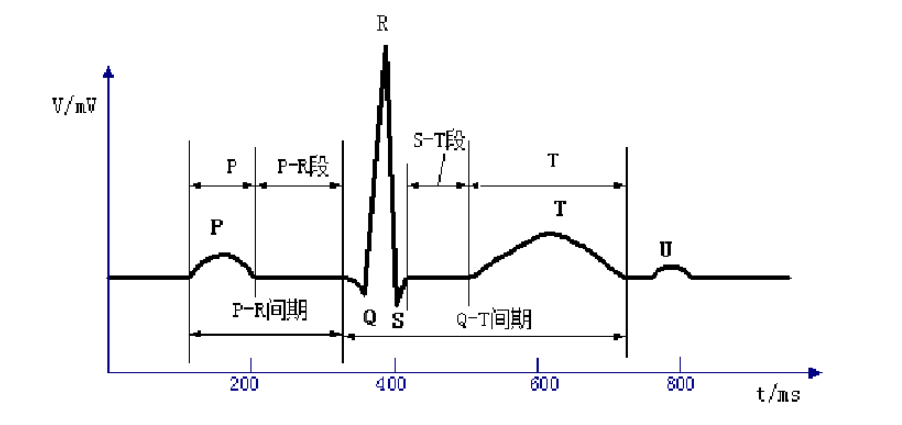 心脏在搏动之前,心肌首先发生兴奋,在兴奋过程中产生微弱的电流,该电流经人体组织向各部分传导,由于身体各部分的组织不同;各部分与心脏间的距离不同,因此在人体体表各部位,表现出不同的电位变化,这些电位变化可通过导线送至记录装置即心电图机记录下来,形成动态曲线,这就是所谓心电图(electrocardiogram,ECG),也称为体表心电图。正常的人体心电图可以反映心脏激动电位的变化,是由一系列重复出现的下列各波、段和间期组成。