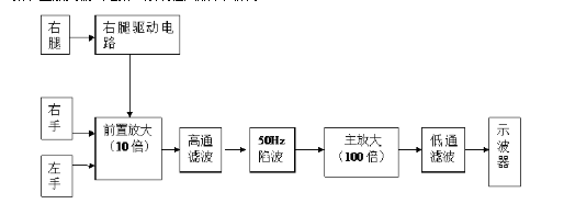 人体接地是造成触电事故的一个重要原因,因此取消人体接地是最根安全用电措施。人体接地本来就是在没有高质量的放大器情况下采取少共模信号的应急措施。测量心电图时,如果病人右脚不接地,由于杂散分布电容的影响,病人身上将会产生很高的共模电压。因此,最理想的方法是设计出一种既能减少共模干扰又能取消人体接地的电路。右腿驱动的工作原理是将由人体体表获得的共模电压通过负反馈放大的方式输回人体,从而达到抵消共模干扰的作用,从根本上抑制共模电压。