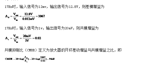 测试方法:测试不同频率时信号的差模输出,输出信号比上输入信号,得其放大倍数。