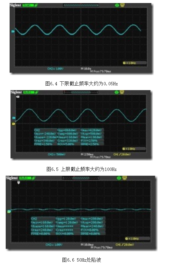 从上图可看出,除去采集过程中由于示波器或其他原器件带来的误差外,该心电采集放大电路的通频带大致符合设计要求,即通频带为:0.05Hz~100Hz。并且还可看出在50Hz附近有明显的衰减。
