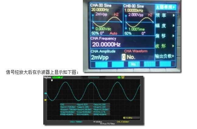 将调试好的各模块连接起来,输入2mV,20Hz的正弦波信号,检测到的信号波形如下图所示: