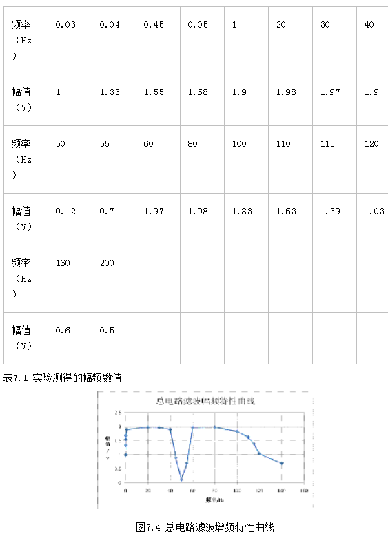 由上表数据可以看出滤波器的通频带宽大概为:0.05Hz—100Hz。与理论值差不多。
