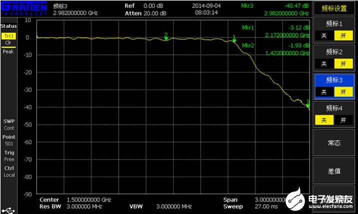 比如要测试低通滤波器频率响应, 我们就需要带跟踪源的频谱仪,再比较LPF接之前和之后的频率响应有多少变化, 打开先将频谱仪工作调好中心频率fc,SPAN ,然后频谱仪输出端和输入端用电缆相接,打开跟踪源开关,进行归一化校正,记录测得参考。把滤波器连接到频谱仪上,此时可测得滤波器输出电平与频率的关系曲线,从而获得插入损耗L,频率响应,带宽等参数。