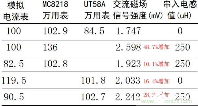 如果外部串入250uH的电感,此时如果维持模拟电流表、MC8218、UT58A显示在100mA左右不变,此时外部的交流磁场强度分别增加了48.7%, 10.1%, 28.3%。