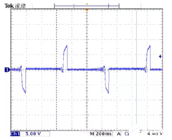 由于电感中等效串联电阻Rs很小,在100mA下,对应的恒定电压只有0.1V,所以上面测量波形中,能够比较明显的就是恒压输出脉冲信号了。这个波形与前面分析的波形是一致的。