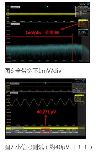 R&S公司采用自己研发的优异性能垂直增益放大器,保证示波器在达到最小1mV/div的灵敏度(非显示放大)同时也能保证示波器在全带宽情况下工作。如图6所示,该示波器为R&S RTO1044示波器,带宽为4GHz。可以看出,在1mV/div灵敏度是,4GHz示波器带宽不受任何限制。那么R&S示波器到底能测多小的信号呢,我们做了如图7所示实验,可以看出在信号Amplitude值小至约40μV时,R&S示波器同样能够轻松测量。那能不能测更小的信号呢,感兴趣的读者可以继续尝试:)