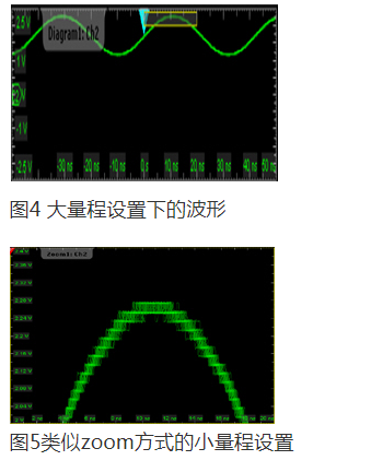 因此,对于信号的测量精度,在模拟部分,特别是垂直增益放大器就起了至关重要的作用。当然,ADC的量化误差对信号测量精度同样有影响,不过在之前的文章中有讨论,我们就不累述。垂直增益放大器相关指标主要涉及到垂直灵敏度、DC增益精度等。DC增益精度体现了放大器的线性性能,用百分比表示。R&S示波器DC增益精度手册给出的值一般在±1.5%,但实测值还会更小。对于小信号测量,垂直灵敏度更为重要。它体现了对信号的放大能力,单位用 mV/div或 V/div表示。众所周知,进行波形测量时需要调整垂直旋钮,使波形尽量占满示波器整个显示栅格。示波器厂家也一般推荐使波形至少达到80%以上的垂直区域。这样做的目的是使测量当中的量化噪声尽量小。比如,在2mV/div时测量结果的量化误差肯定会比1mV/div时大一倍。因此,在进行小信号测量时,比如毫伏级甚至微伏级的信号,我们需要将垂直灵敏度设置到最小才能尽可能的降低量化误差的影响。由于各个示波器厂家的垂直增益放大器各不相同,因此体现出来的放大性能也不一样,垂直灵敏度所能达到的最小值也不一样。目前业内能达到的最小垂直灵敏度为1mV/div。但这一指标并非所有厂家都能达到。有的垂直旋钮可以调到1mV/div这样的小量程,但却不是放大器真正的放大,而是通过显示放大(Magnification)的方式,类似于Zoom。图5可以看出,这种显示放大到达的小量程设置,虽然图片放大了,但量化误差还是大量程下,如10mV/div或5mV/div的等级。