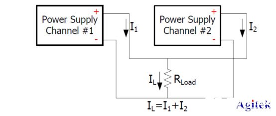 并联电源的输出电流是所有通道的输出电流之和。以两个通道并联为例,接线方式如下图所示。