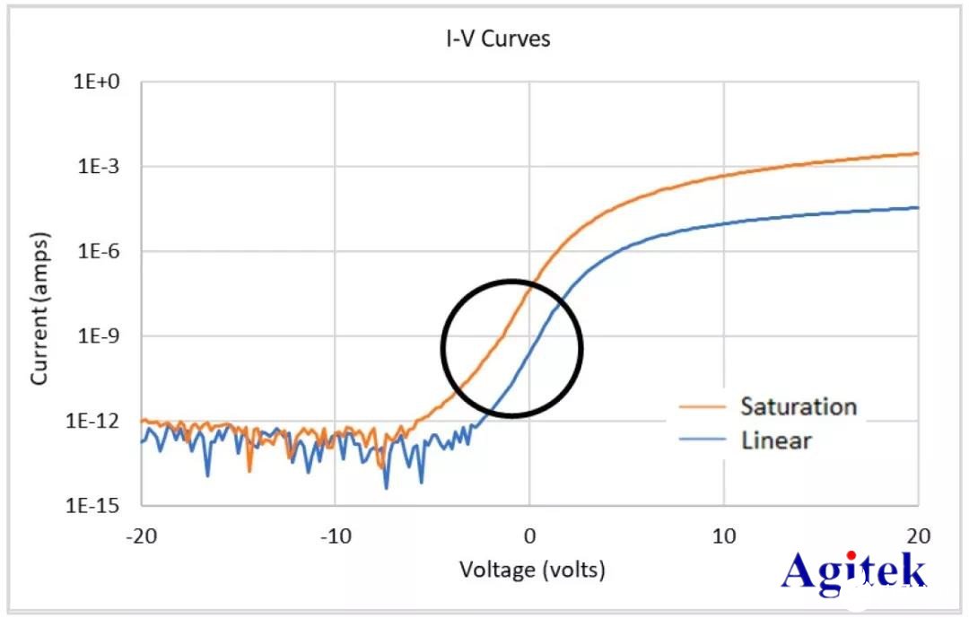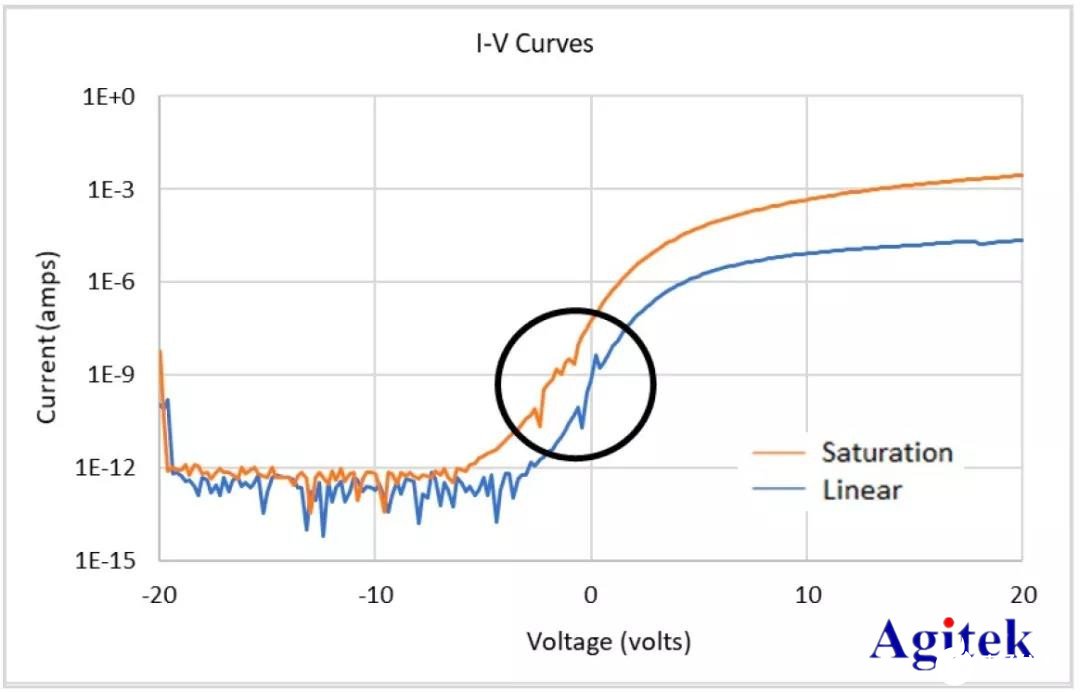 图2.传统SMU测得OLED饱和及线性I-V曲线