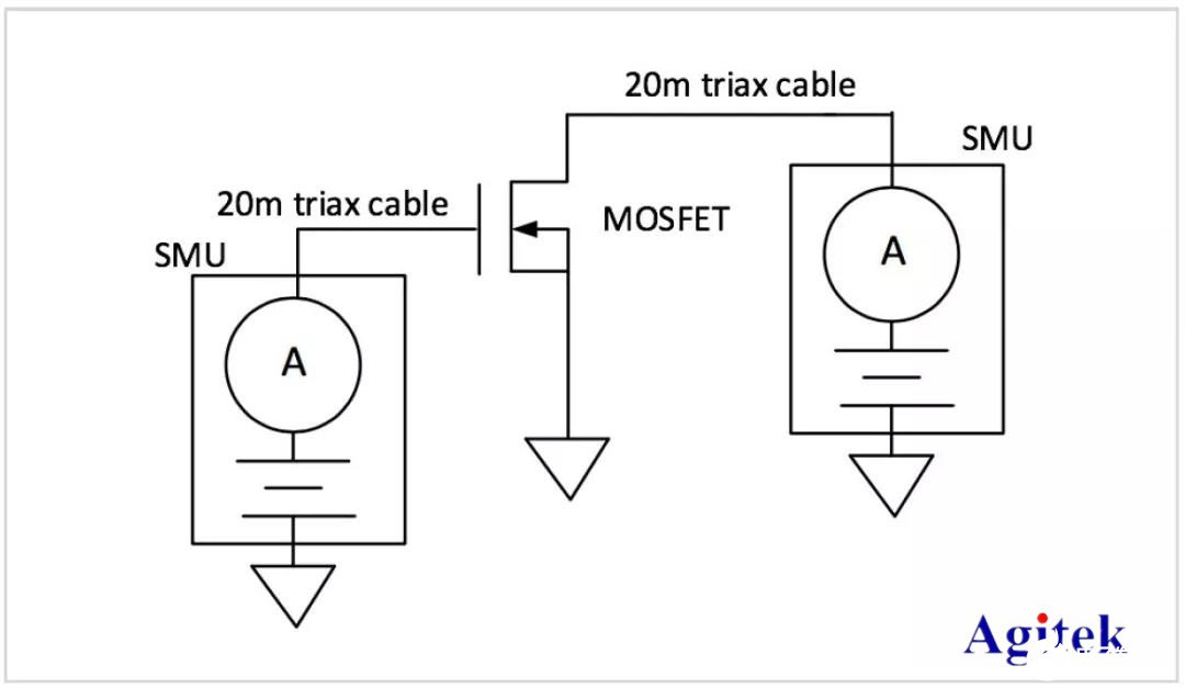 可以使用两个SMU生成n型MOSFET的Id-Vg曲线。一个SMU扫描栅极电压,另一个SMU测量漏极电流。图4是典型测试电路的电路示意图,其中使用20m三芯同轴电缆把SMU连接到器件端子上。