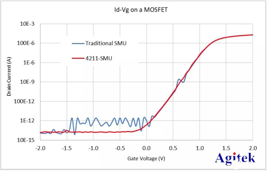 图5显示了使用两个传统SMU及使用两个4211-SMU测量的传递特点。蓝色曲线(使用两个传统SMU获得)在曲线中显示了振荡,特别是在弱电流及改变电流范围时。红色曲线是使用两个4211-SMU得到的电流测量,非常稳定。