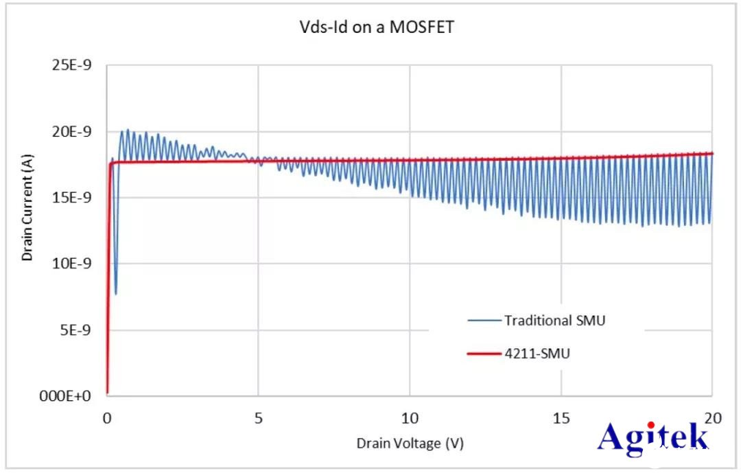 在测量通过开关矩阵连接的FET器件的输出特点时,使用两个4211-SMU较使用两个传统SMU的结果明显改善。在这项测试中,其中一个SMU被偏置恒定栅极电压,另一个SMU扫描漏极电压,测量得到的漏极电流。使用两个传统SMU (蓝色曲线)和两个4211-SMU (红色曲线)生成的漏极电流相对于漏极电压关系曲线如图7所示。