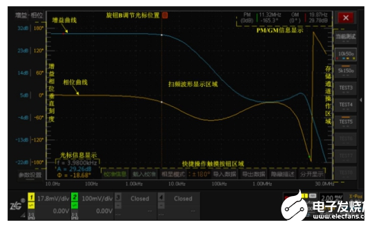 在开关电源、运放反馈网络中,环路分析可以测量系统的增益、相位随频率变化的曲线(伯德图),分析系统的增益余量与相位余量,以判定系统的稳定性,ZDS4000 内嵌的环路测试分析软件不仅有完善的环路测试方法和精准的测量精度,并且对测试操作和用户体验进行了创新性地设计。