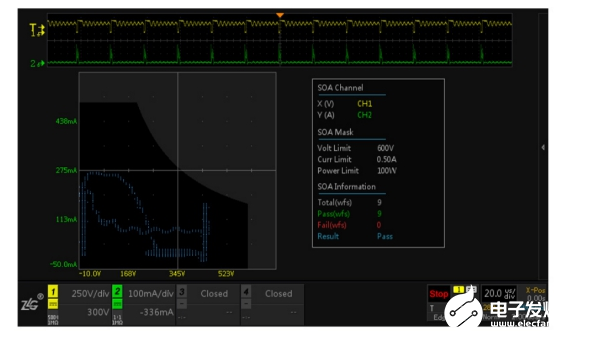 开关器件长期承受较大功耗,一但过压或过流就可能会导致器件损坏甚至爆炸。通过ZDS示波器定制的SOA安全工作区测量功能,可以准确评估整个工作周期内开关器件的所有状态,明确给出电源超出安全工作区的异常概率,便于工程师更好的评估电源工作稳定性。