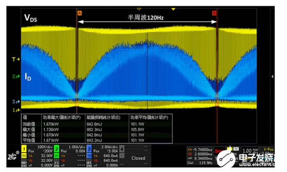 PFC MOS管开关损耗测试是电源调试中的难点,由于不同周期的电压和电流波形都不相同,功率损耗的准确评估也更依赖长时间高采样率的波形捕获,因此存储深度和功率损耗运算原始点数成为开关损耗准确与否的关键。