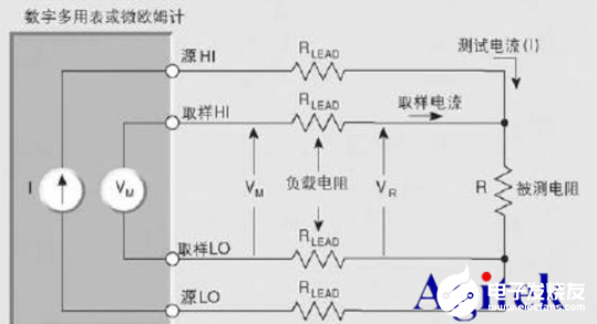测量结果为R=VM/I, 从图1的工作电路图我们可以得知这个测试结果实际上包含两部分:被测电阻R与两条引线电阻2*RLEAD。典型的引线电阻阻值大致在1毫欧到10毫欧,当然在被测电阻阻值较大的情况下,引线电阻的影响是可以被忽略的;但当被测电阻较小或者测试精度要求较高的情况下,引线电阻这项附加的误差源就不能够被忽略了。