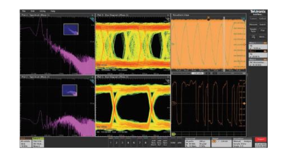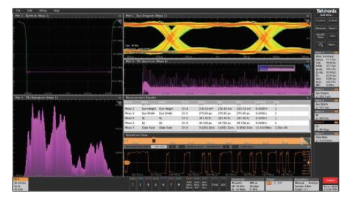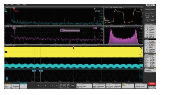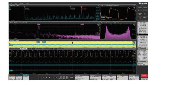 电源轨道噪声通常称为纹波,一般在几毫伏。在几GHz频率的电源轨道上准确测量几mV噪声,要求使用高DC阻抗的高带宽探头,其在高频下作为50 Ω传输线操作。TPR1000和TPR4000电源轨道探头就是专为这一目的设计的。在选配6系列B MSO数字功率管理(6-DPM)分析包后,您可以在多条电源轨迹上自动进行功率分析,该分析包可以方便地进行关键抖动测量(TIE, RJ, DJ, PJ)。