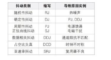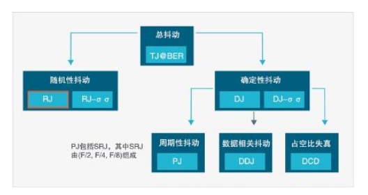 在划分抖动时,首先要把TIE分布分成随机性成分和确定性成分,也就是RJ (随机性抖动)和DJ (确定性抖动)。DJ进一步划分成与数据中的位序列有关的抖动—DDJ (数据相关抖动),以及与其无关的抖动,如PJ (周期性抖动)。