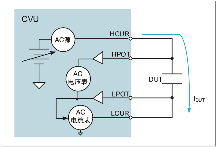 时域AC值被处理到频域中,生成相量形式的阻抗。CVU使用自动平衡电桥(ABB) 方法测量电容。ABB用来抵消DUT 一个端子( 如果AC电流表在LCUR上则为LPOT) 上已知频率的AC信号,以警戒杂散阻抗。这个AC接地会把CVU的LPOT保持在0 VAC,这样测试电路中的所有AC电流都会流到AC电流表,而不会经过测试电路中的任何并联电容。