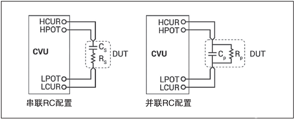 DUT测量的典型模型通常是一条串联或并联电阻电容(RC) 电路。如图3中简化的模型所示,CVU既可以作为串联配置(RSCS) 测量DUT,也可以作为并联配置(RPCP) 测量DUT。