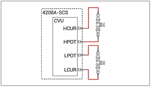 随机自带的附件可以通过BNC或SMA连接,来连接测试夹具或探头。图6显示了CVU以及为2线传感配置的随机自带的附件。CS-1247 SMA到BNC转接头连接到每条CA-447A SMA到SMA电缆。HCUR和HPOT端子通过CS-701A BNC T形装置连接,构成CVH;LCUR和LPOT连接在一起,构成CVL。使用随机自带的扭矩扳手,紧固SMA电缆连接,确保接触良好。红色SMA电缆为100 Ω。并联的两条100 Ω电缆是50 Ω,这是高频源测量应用的标准配置。