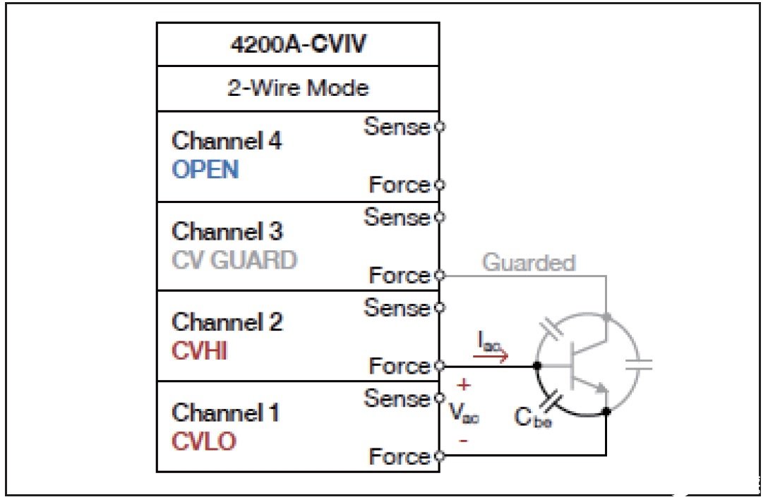图10显示了把CVU的CVHI端子、CVLO端子和CV Guard端子通过4200A-CVIV的输出连接到BJT的三个端子上。在这个实例中,CV Guard通过4200A-CVIV的通道3切换到BJT的集电极端子上,这样就可以测量CVHI和CVLO之间的基极发射器电容。