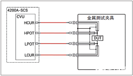 图7是DUT 4线传感实例。在本例中,HCUR和HPOT端子连接到器件的一端,LPOT和LCUR端子连接到器件的另一端。为了改善带宽,我们把同轴电缆的外部屏蔽层连接到金属测试夹具上。我们使用到器件的4线连接,通过尽可能靠近器件传感电压,来简化灵敏的测量。