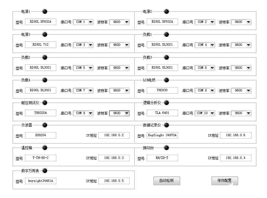 点击进入测试,在上方菜单栏会看到硬件设置,点击可进入仪器连接界面,如图所示,界面会显示当前产品测试需要使用的仪器列表。软件会默认最后一次的配置信息,如有变动,需要用户进行手动更改。用户可保存每次变更后的配置信息,以便下次直接调用。配置完成后,点击自动检测按钮,软件会提示仪器连接状态,若连接成功,LED指示灯会以绿色显示。