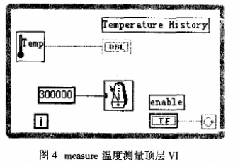 恒温区测量程序采用如图3所示的层次化结构,它由三层构成,即顶层模块measure、第二层Temp及由子Read和calcu构成的底层VI模块。在屏幕上实时显示各被测点温度曲线的顶层VI (measure)结构如图4所示。它调用了温度测量、处理子程序Temp,相应的温度值由Temperature History(T_history)显示出来,启动使能开关(Eable),即可自动以波形图的形式(T-wave) 实时显示不同位置处的炉温。直至得到整个炉膛的温度分布曲线,测出恒温区段。