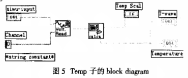 系统的第二层是处理子程序(Temp子VI)内部构成如图5所示,它调用了底层子VI Read和calcu。Read是温度采集子程序,它对DAQ卡采集的被测电压信号进行预处理( e.g:滤波、拟合);calcu是数值处理子程序,它对所得到的信号进行数值处理,把电压信号转换为相应的温度值。从而得到各被测点的温度值。