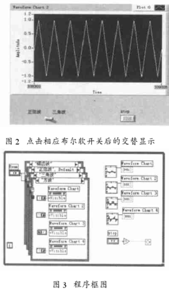 在前面板设计中,放置两个波形显示控件(本例中采用的是Wave Chart)分别用于显示正弦波和三角波,用一个布尔软开关控制两个波形显示控件交替工作。框图程序设计如图1所示,用While循环使程序保持连续执行,程序中调用了Sine Wave和Triangle Wave两个VI,分别产生正弦波和三角波,其输出连接到Wave Chart 1和Wave Chart2。用选择结构来控制Wave Chart 1和Wave Chart2的属性节点(Property Node),实现显示和隐含控制。当选择结构的左边框上的选择端口连接的为布尔量时,相应的图形代码窗口有2个,其框图标识符的值为True和False两种。在True状态下,将Wave Chart 1的属性节点Visiable的输入参数设置为“假”,Wave Chart 2的属性节点Visiable的输入参数设置为“真”,在False状态下反之。上述程序运行后,点击相应布尔软开关可实现交替显示,如图2所示。本例主要介绍了隐含与显示控制的基本方法。