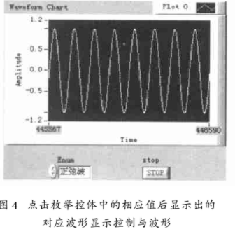 在实际的虚拟仪器的设计中,如需要用多个波形控件来分别显示各种波形或曲线时,且要求在同一时间只需一个波形显示控件出现,可采用枚举法控制实现。例如,用四个波形显示控件分别显示正弦波、三角波、方波和锯齿波。程序设计与上述方法大致相同,所不同的是用一个枚举(Enum)型控件作为选择结构的选择端口的控制量,此时图形代码窗口应有四个,并在枚举型控件中分别添加4个值:正弦波、三角波、方波和锯齿波,同时在每个图形代码窗口中放入所有波形显示控件的属性节点,并设置相应的布尔常数。 框图程序如图3所示,程序运行时,点击枚举控件中相应值,屏幕上就显示出对应的波形显示控件与波形,界面如图4所示。