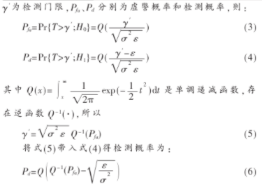 认知无线电在检测频谱空洞时,通常是通过分析认知用户感知到的信号中是否存在授权用户信号,进而判断感兴趣的频谱是否处于空闲状态。因此,频谱检测过程可以描述成一个二元检测问题,检测模型为: