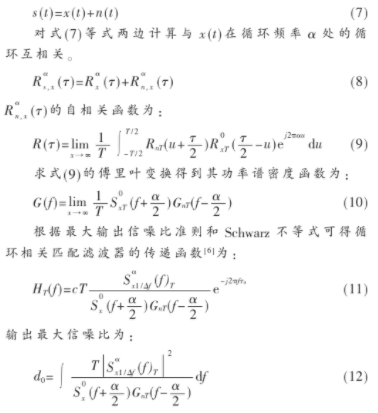 循环相关匹配滤波器与一般的匹配滤波器不同,是建立在谱相关分析的基础上,它的传递函数和最大信噪比都与其谱相关特性有关。设观测到的信号s(t)如式(7)所示:
