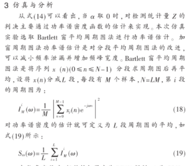 由于周期图估计出的功率谱不够精细,分辨率较低,因此对周期图法进行修正,将信号序列分为n个不相重叠的小段,分别用周期图法估计,并将估计结果的平均值作为整段数据功率谱估计的结果。通过对功率谱密度函数的估计计算检测统计量,再与预先设定的门限值进行比较,判断是否可以使用该频段。
