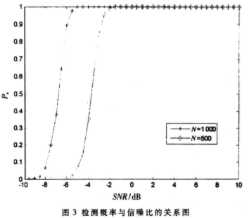 在仿真实验中,假设授权用户为BPSK调制, fs为55 Hz, 并加入均值为0、方差为1的高斯白噪声。当采样点数分别为1 000和500时,采用蒙特卡罗方法进行仿真,仿真次数为500次,如图3所示。从图中可以看出检测概率随着信噪比的增大而增加,而且采样点数越多,检测概率性能越好。当N=1 000时,信噪比在-6 dB时的检测概率达到100%;而当采样点数为500时,在-2 dB检测概率达到100%。